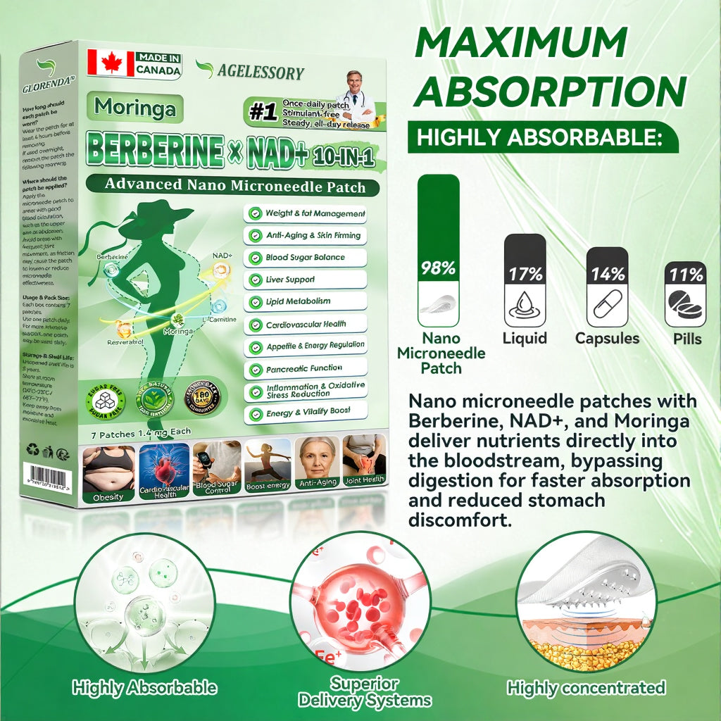 AGELESSORY®𝑴𝒐𝒓𝒊𝒏𝒈𝗮 · 𝗕𝗲𝗿𝗯𝗲𝗿𝙞𝙣𝙚 × 𝙉𝘼𝐃+ 𝟏𝟎-𝐢𝐧-𝟏 𝗔𝗱𝘃𝗮𝗻𝗰𝙚𝙙 𝙉𝙖𝙣𝙤 𝙈𝙞𝙘𝙧𝙤𝙣𝙚𝙚𝐝𝐥𝐞 𝐏𝐚𝐭𝙘𝙝: 98% Absorption Rate, Transforming Weight, Liver, Gut & Skin Health